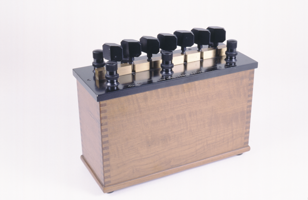 Rectangular wooden box with ebonite top; seven brass terminals, ebonite-covered; brass blocks with receptors for seven plugs; six brass and ebonite plugs; six coils suspended from underside of top plate; metallic shielding inside box connected to terminal marked ‘SHIELD’.