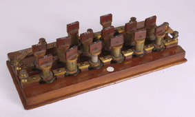 Rectangular wooden base; brass and ebonite blocks supporting coils, with seven brass terminals; two copper terminal straps; fourteen removable coils, wound on wooden bobbins with brass bases and red ebonite tops.