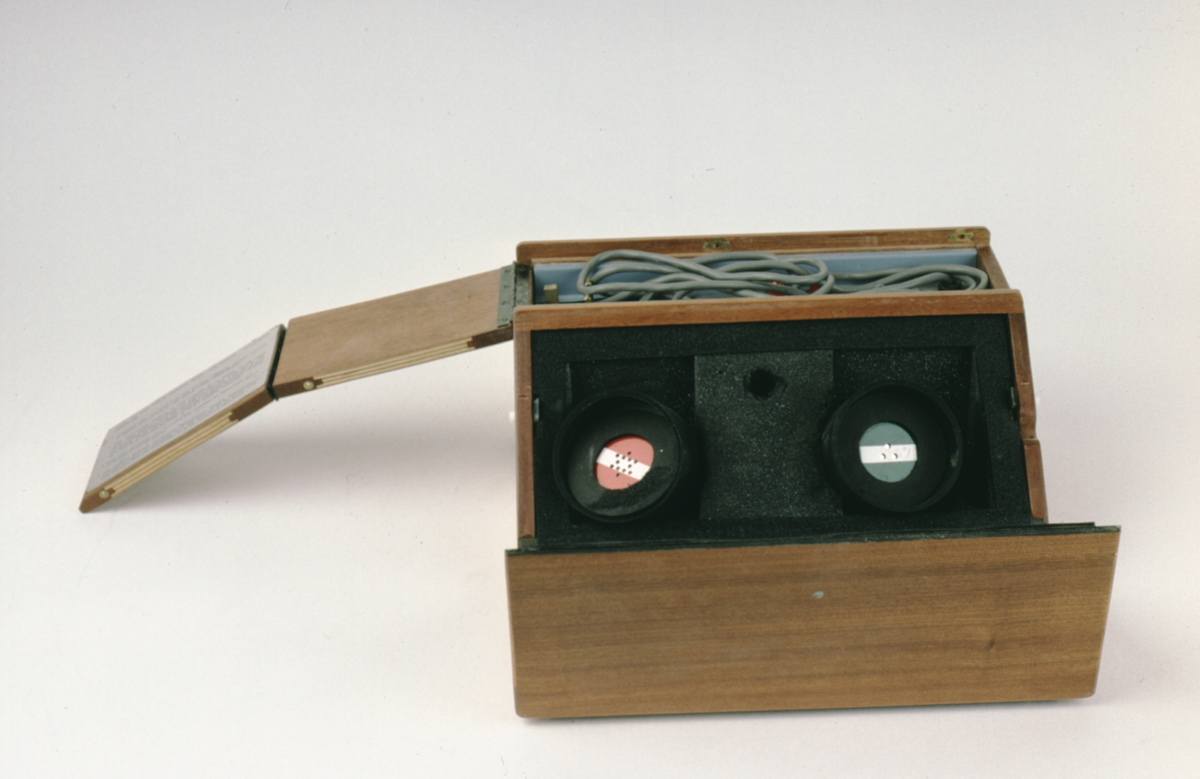 Wooden box with sectioned lid, front of which opens to reveal rest for telephone receiver and control panel with power indicator and two switches, one marked ‘FULL DUPLEX HALF’, the other marked ‘ON’. Directly above the switches are two red lights made of a plastic casing containing a bulb. These lights are marked “POWER” and “DATA”. To the left of the lights is the fuse “500mA” a black plastic knurled head which screws into the board. On the far right is a choice of two interface sockets one marked “CCITT” the other “20mA”. Power is through a standard mains cable etc.