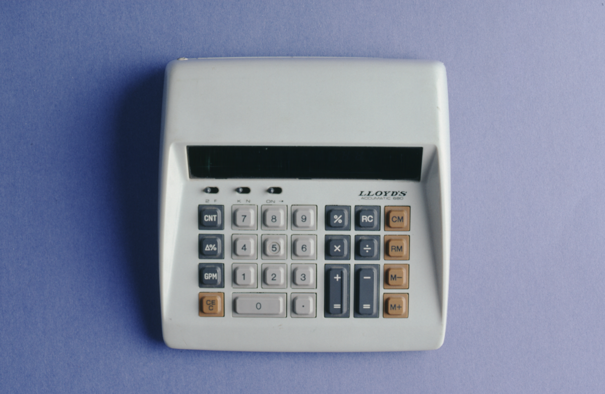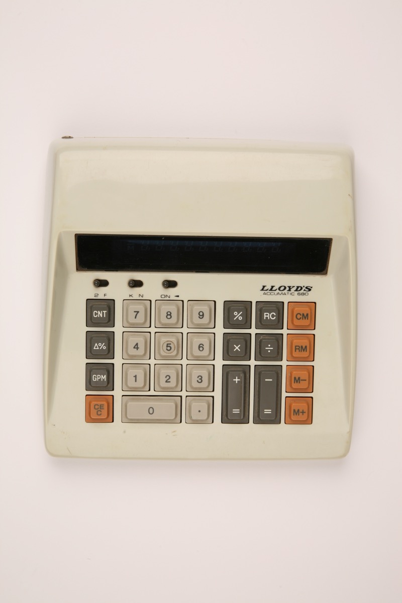 Grey Lloyd’s Accumatic 680 (E680-2), with pale grey number keys, orange memory and clear keys and all other function keys in grey. At front top are an on/off switch, a ‘K’ switch and a switch for changing the number of decimals on display.