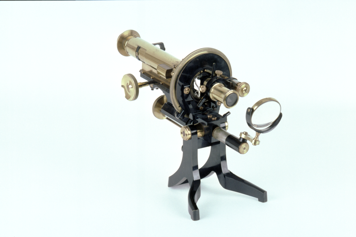 “Survey” Model; black finish with brass screws and fittings; kettledrum / claw-foot stand; pair of uprights with a brace and support for the instrument in a horizontal position; pivoting limb; circular stage with knurled brass ring divided 0 - (360) by 10 to 1; stage clips; vernier to 5’; substage mounted on a swinging arm to move it out of the optic axis when on the lowest point of a lateral screw thread; condenser with uppermost lens on a sliding shoe with a steel clip to push to away from the lower condenser; iris diaphragm; stop; polariser; divided flange 0 - (360) by 45; swinging plano / concave mirror on a brass arm from a shoe round the tailpiece; cranked moulded limb, pair of brass coarse focus screws either side of the limb; fine focus ring at the head of the column divided (0) - 5mm to 0.1; index on the back of the limb; push fit eye piece; flange below eye piece; slot below flange with brass collar; slot in sliding tube in middle of body for a Bertrand Lens and stop; slot with brass cover for micrometer; double nosepiece. 2 objectives in brass cases 1 In and 1/4 In.