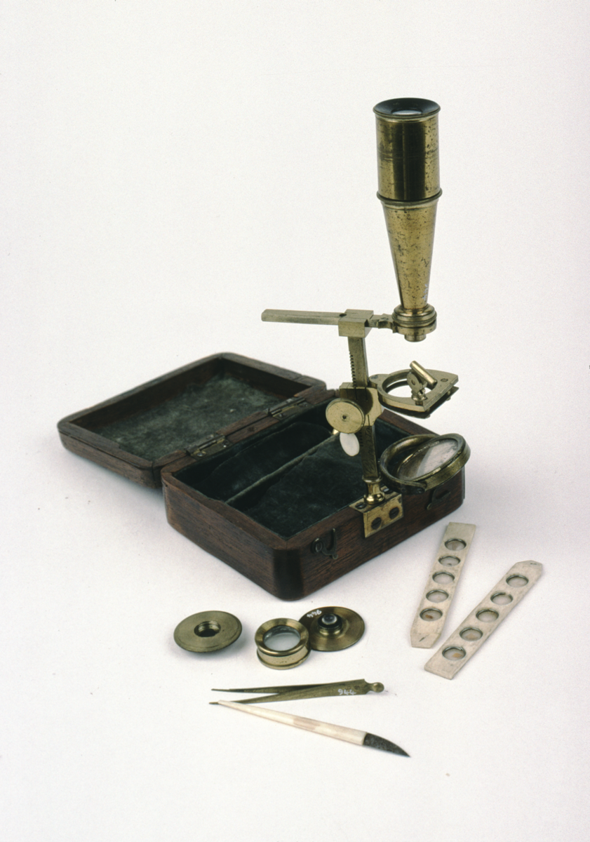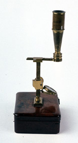 Brass; racked pillar screws into lid of box; swinging concave mirror fits into pillar; stage mount with knurled screw operating on rack; circular stage with spring below; compound body screws into holder which slides into shoe at head of pillar; 2 objectives screw to tapered body with field lens; cylindrical collar to eyepiece. (knurled headed screw and objective - [not original])