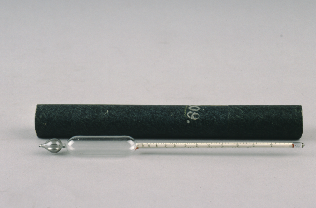 Lower bulb for mercury weight, central elongated bulb topped by tube containing paper scale divided 30 - [94] numbered by 5 subdivided to 1 and also [17] - [39.5] numbered by 2 subdivided to 0.5. Scale attached to inside of tube with red sealing wax (?). Green slip case marked ‘G209.’ and lid marked ‘30-95 / C / no. 1/8’ (accession register says that case is not original, but has been used for the object for some time).