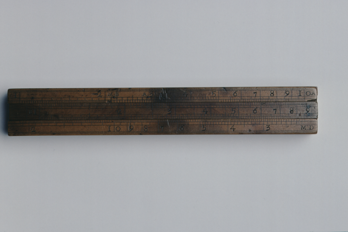 First face: single log scale divided 1 - 10, marked ‘A’ on stock and ‘B’ on slider, numbered by 1, 1 - 2 subdivided to 0.02, 2 - 5 subdivided to 0.05, 5 - 10 subdivided to 0.1; brass gauge points let in on stock at ‘MB’ (malt bushel) and ‘A’ (ale gallon), and on slider at ‘W’ (wine gallon). Lower part of stock has inverted scale marked ‘M:D’ (malt depth) divided [2.15] - [21.5], numbered 3, 4...10, 2[0]; 2.15 - 5 subdivided to 0.05, 5 - 10 subdivided to 0.1, 10 - 20 subdivided to 0.2, 20 - 21.5 subdivided to 0.5. Reverse of slide carries table of gauge points.