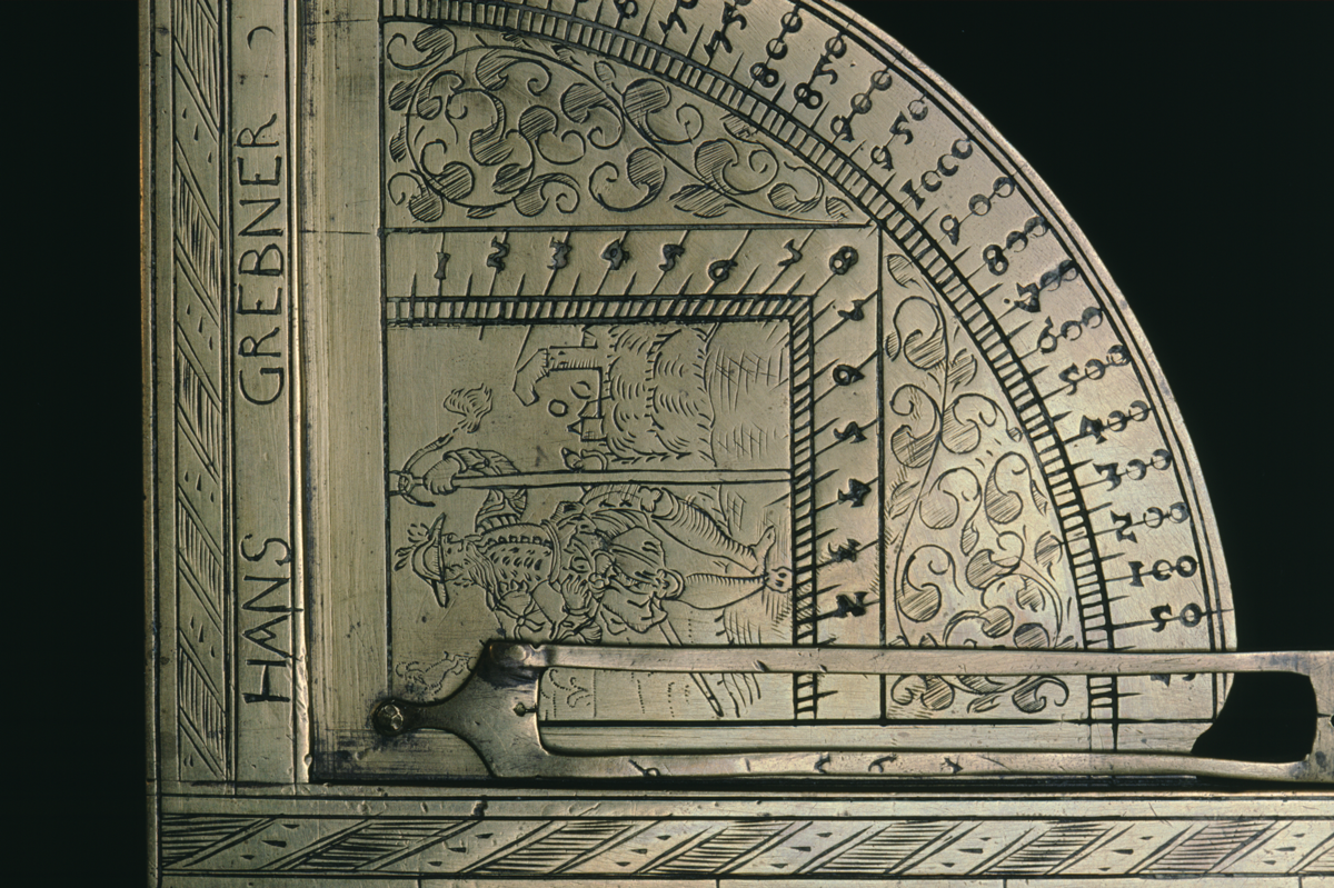 Obverse: on the longer limb scale of inches marked ‘B:S’ divided [0] - 12 numbered by 1 subdivided to 0.25 and scale of ‘PLEŸ: KVGL’ divided [1] - 100 numbered by 5 subdivided to 1. Quadrant set between the 2 limbs with radial cursor (lacking fiducial thread). Quadrant calibrated with a geometric square divided [0] - 8 - [0] numbered by 1 subdivided to 0.25. On the circumference a range scale divided [0] - 1000 - 400 numbered 25, 50, 100, 200 ... 1000, 950, 900 ... 400. Each numbered division subdivided into 4. Leaf decoration and, inside the square, a vignette of a Pike Man.