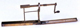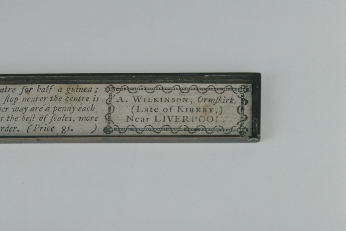 Single turn type. Brass case, beam and pans. Beam graduated 0 - 12 pennies, numbered by 3, subdivided to 1 with 4 notches before 0 for farthings overweight; sprung slide; ‘H’ type hanger with ‘doll’s head’ coin pan with rectangular extension to hanger. Steel tips to hanger and column. Cranked column erected by hinge automatically as box opens. Brass link and rest. End of box mended or modified.