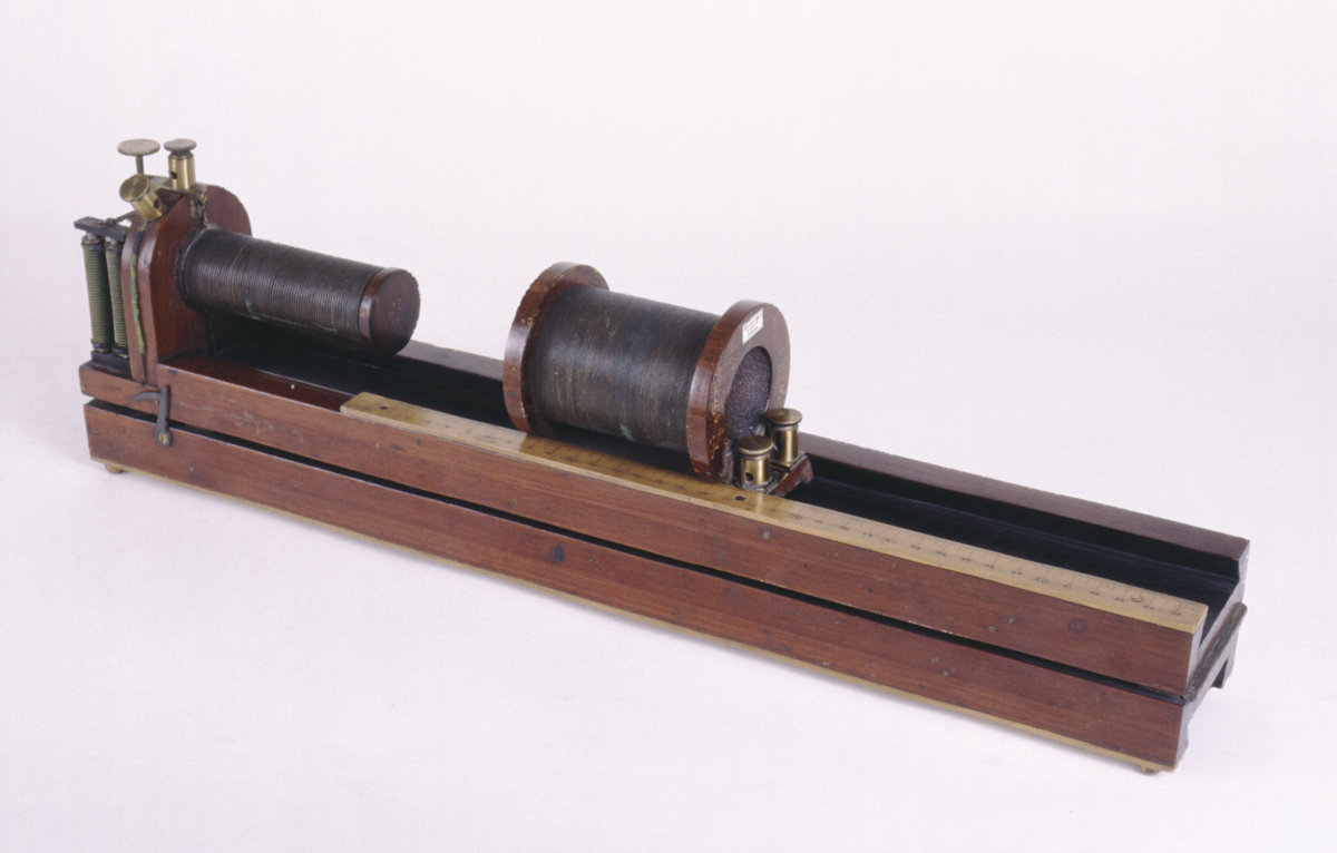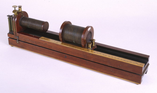 Wooden baseboard, hinged in middle, with channel for sliding secondary coil. 88 cm boxwood scale with millimetre divisions on one side of base plate. Primary coil fixed to wooden support at one end with electromagnetic contact breaker, adjustment and five brass terminals. Secondary coil mounted on wooden bobbin which slides in channel in baseboard and can pass over the primary coil. Two brass terminals on secondary coil.