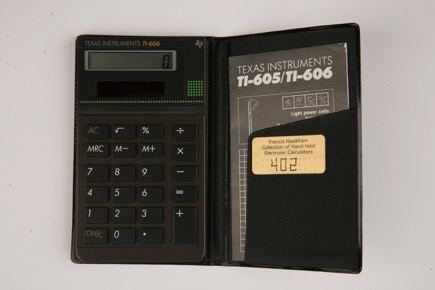 TI-606 electronic pocket calculator in case with instructions, by Texas Instruments, Taiwanese, 1986
